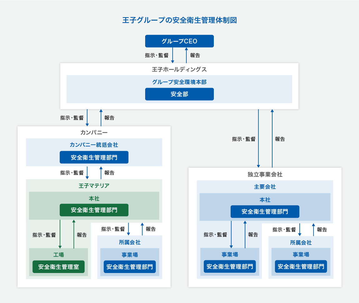 王子マテリアは、王⼦グループで掲げる「コンプライアンス・安全・環境の徹底が企業活動の根幹」「安全絶対優先の基本原則」の⽅針のもと策定された、王⼦グループ企業⾏動憲章や王⼦グループ⾏動規範における労働安全・衛⽣についての定めに準拠し、対応しています。
