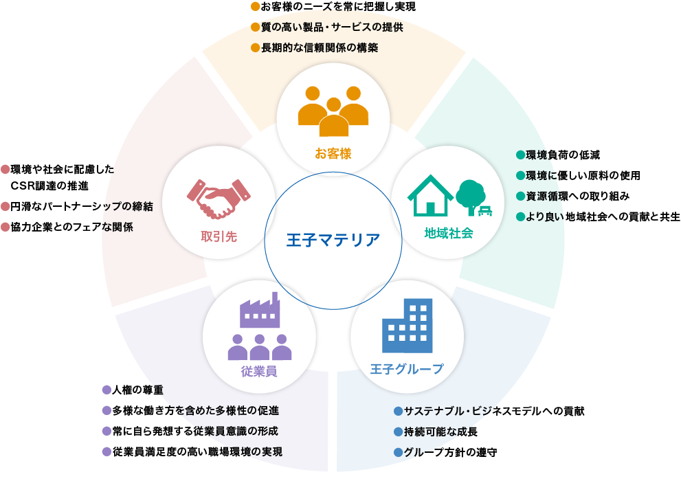 王子マテリアは、お客様をはじめ、お取引先、株主、地域社会、従業員を含めたすべてのステークホルダーの皆様から信頼される誠実な企業を目指しています。すべてのステークホルダーの皆様の社会や当社に対する意識を的確に把握し、対話と協働を通じて信頼関係を構築し、企業価値向上に向けて取り組んでまいります。