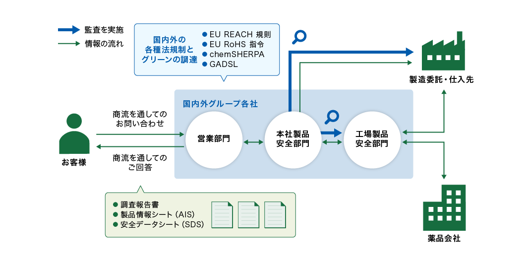 当社は、製品の安全性に関するお客様への情報提供にも取り組んでいます。お客様からいただいた製品の安全性に関するお問い合わせを精査し、「製品情報シート(AIS)」、「調査報告書」等により、速やかにお答えしています。