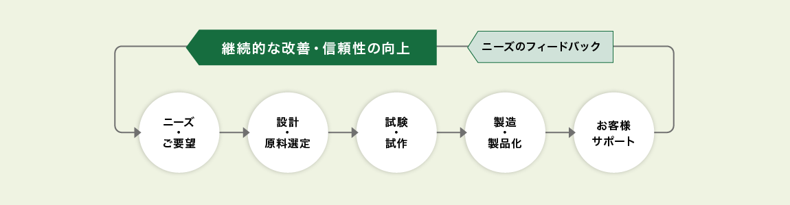 王子マテリアの包装素材製品の開発プロセスにおける取り組みとして、ニーズ・ご要望の把握から、製品開発後のフォローアップまで、お客様からは製品・サービスの品質に対する数多くのフィードバックをいただきます。私たちは、このフィードバックを新たなニーズと捉え、継続的にお客様の製品品質の改善・向上に活用することで、お客様のご要望にあった製品を提供し、信頼性の向上を図っています。