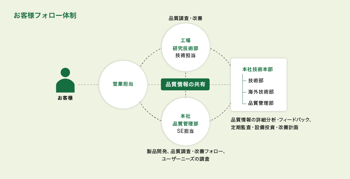 お客様の当社製品の品質に対するフィードバックを確実に取得していくため、本社品質管理部 SE(サポートエンジニア)担当が定期的に営業担当に同行し、お客様の技術的な潜在ニーズの取得にあたっています。お客様に近い視点でニーズを把握することで、柔軟な製品品質の実現に繋げています。