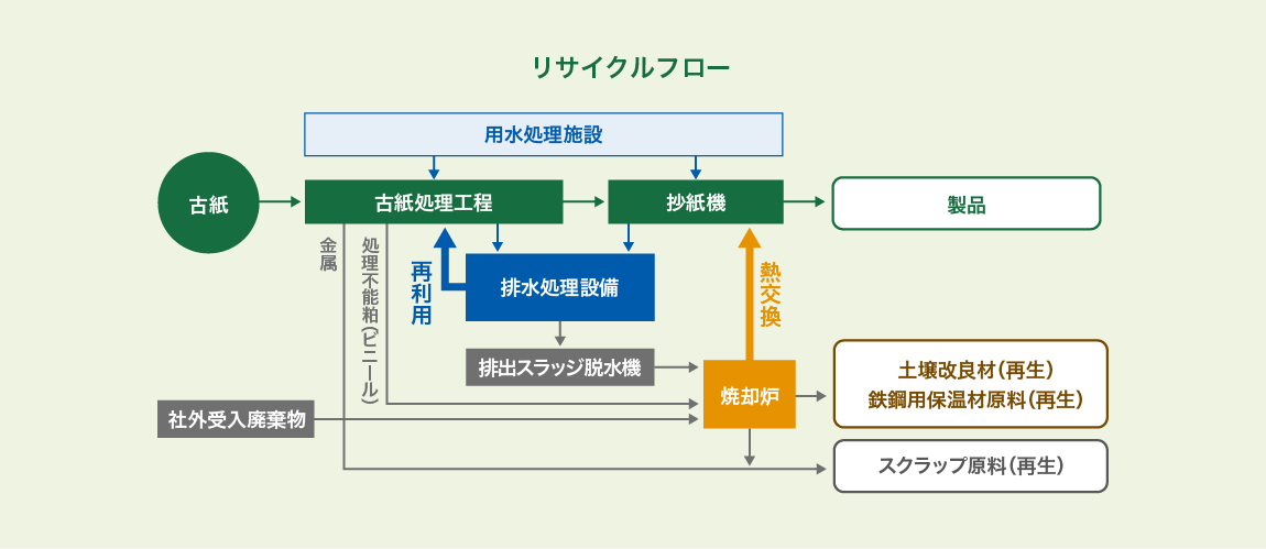 古紙より紙となる原料を取り出す際に排出されたプラスチックなどを燃焼させるエネルギーとして、また製品に使用される水も排水処理設備を介して再利用し有効活用しています。事業、製品に関わる全ての面からリサイクル、有効利用に努めることで、より地球、社会環境に配慮した事業活動を目指しています。